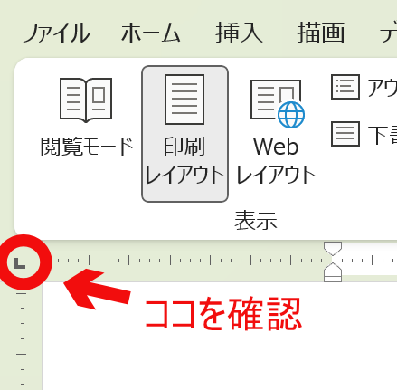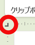 まず、「ルーラー」の一番左にある「タブ」の形が下図のような「左揃えタブ」になっていることを確認します。