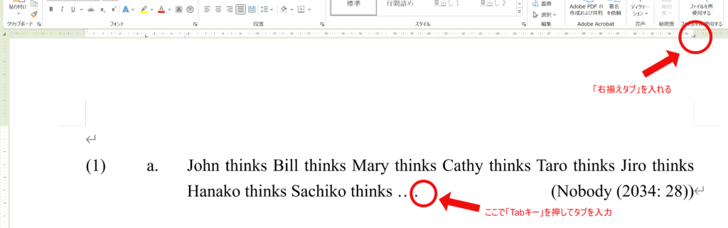 先ほどは「左揃えタブ」を使用しましたが、今回は「右揃えタブ」を使用します。
