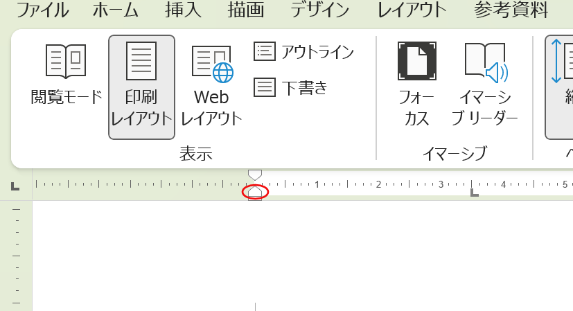 「ルーラー」(定規のような目盛り)が表示されていない場合は、「表示」→「ルーラー」にチェックを入れることで表示されます。