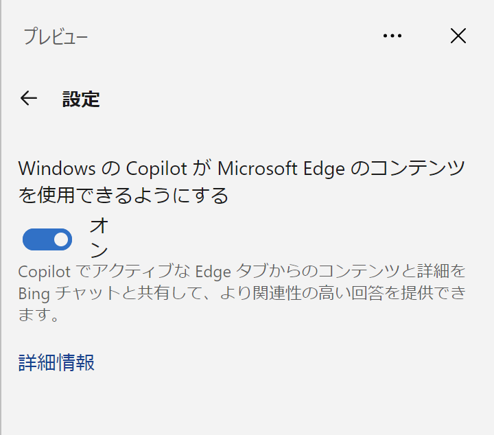 事前に、Windows Copilot上部の設定画面から、「WindowsのCopilotがMicrosoft Edgeのコンテンツを使用できるようにする」をオンにしておきます。